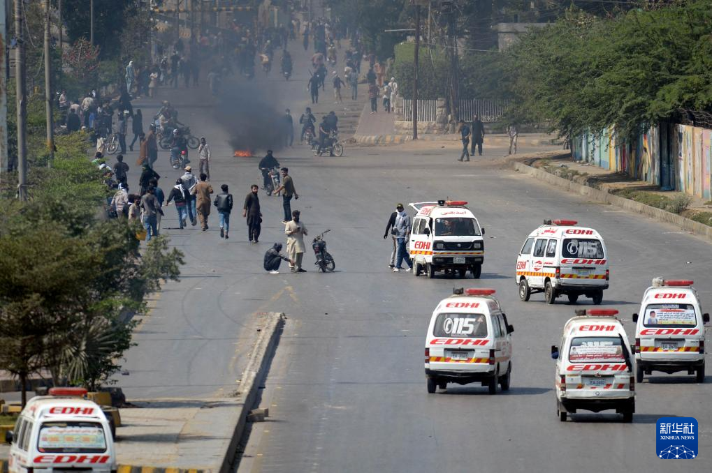 3月1日,在巴基斯坦南部城市卡拉奇的美国驻卡拉奇领事馆附近,抗议人群与安全人员发生冲突。新华社发(伊姆兰·阿里摄)