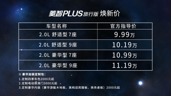 8月11日,东风风行菱智PLUS旅行版正式上市,新车共推出4款车型,官方指导价格9.99万元-11.19万元。