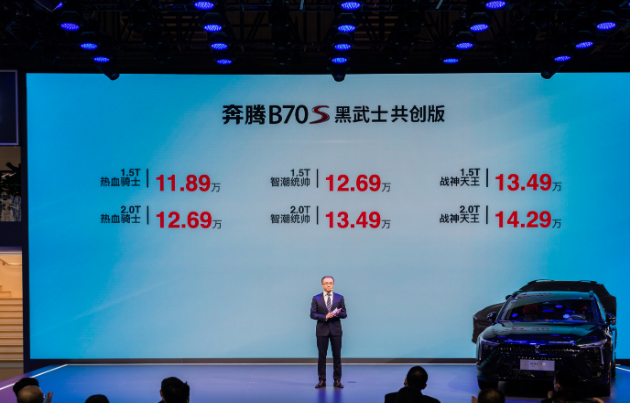 当日,B70S黑武士共创版上市,售价区间为11.89-14.29万元。新车是一汽奔腾首款用户共创、官方量产车型。