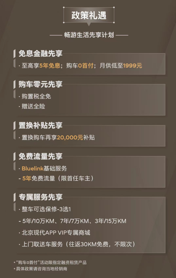 专属服务先享:整车保修3选1(5年/10万公里、7年/7万公里、3年/15万公里);北京现代APP VIP专属商城;上门取送车服务(往返30公里免费,不限次)。