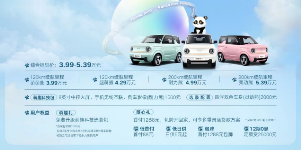 2月6日,吉利熊猫mini宣告正式上市。熊猫mini提供200km和120km两种续航版本共4款车型,售价区间为3.99万元-5.39万元。