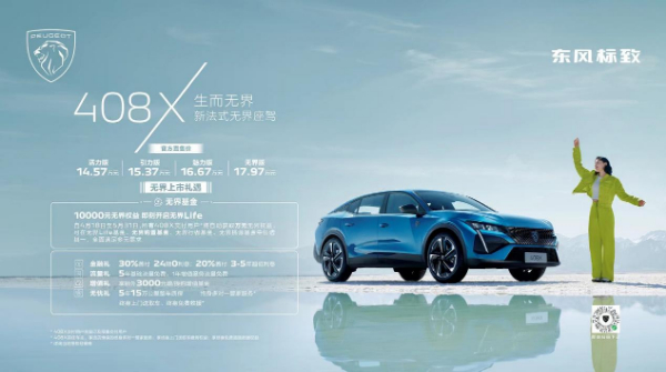 4月18日,在第二十届上海国际车展上,东风标致“新法式无界座驾”408X正式上市。官方直售价分别为活力版14.57万元、引力版15.37万元、魅力版16.67万元、无界版17.97万元,可通过东风标致官方APP或小程序下订。