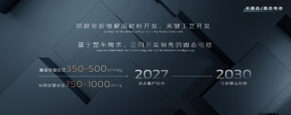 推进全新电解质材料开发、关键工艺开发,将不晚于2027年推动重量能量密度达到350-500Wh/kg、体积能量密度750-1000Wh/L,并逐步量产应用,2030年实现全面普及,彻底解决用户里程焦虑。