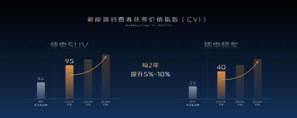 此外,长安汽车还将围绕用户思维,不断升级优化“新能源消费者获得价值指数(CVI)”(以“性价重体比”为参量开发的模型指数)。长安汽车将通过不断的技术迭代,以及整车和电池系统的创新,到2025年,长安新能源汽车的同类型产品的CVI值将分别达到95和40,后续每2年提升5%-10%。