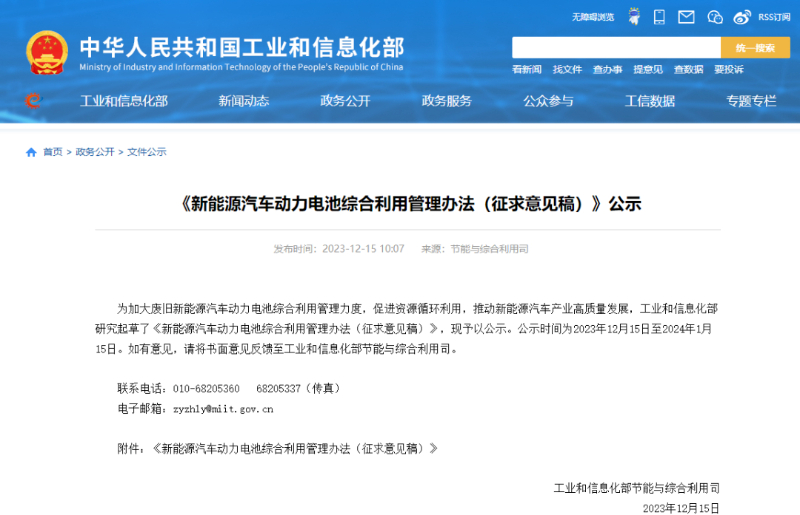 12月15日,工信部发布《新能源汽车动力电池综合利用管理办法(征求意见稿)》(下称《办法》),即日起至2024年1月15日,向社会公开征求意见。《办法》对汽车生产企业、电池生产企业、梯次利用企业在动力电池综合利用过程中应承担的责任做出安排。同时,鼓励电池生产企业优先使用再生原材料,鼓励有条件的地方在政府投资工程、重点工程、市政公用工程中使用获证梯次利用产品。