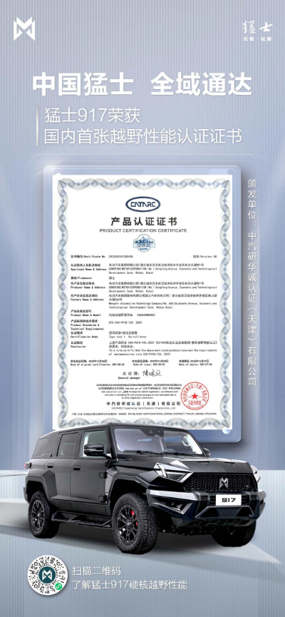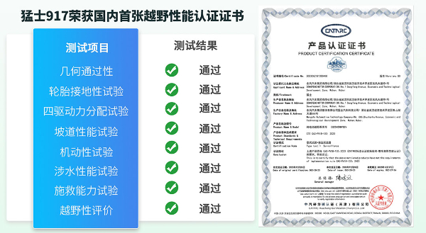 图:猛士917通过国内首个越野性能认证全部挑战,荣获认证证书
