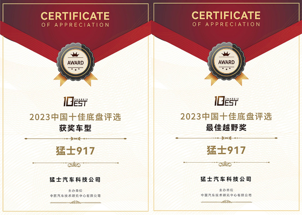 图:2023年9月,猛士917荣获“2023中国十佳底盘评选”与“最佳越野奖”双料奖项
