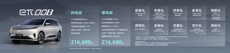 eπ008增程车型与纯电车型均只有一个配置,售价同为21.66万元,限时到手车价18.86万元起!起步规格即已达到同级产品高配配置,并提供特色化选装包以满足客户个性需求。