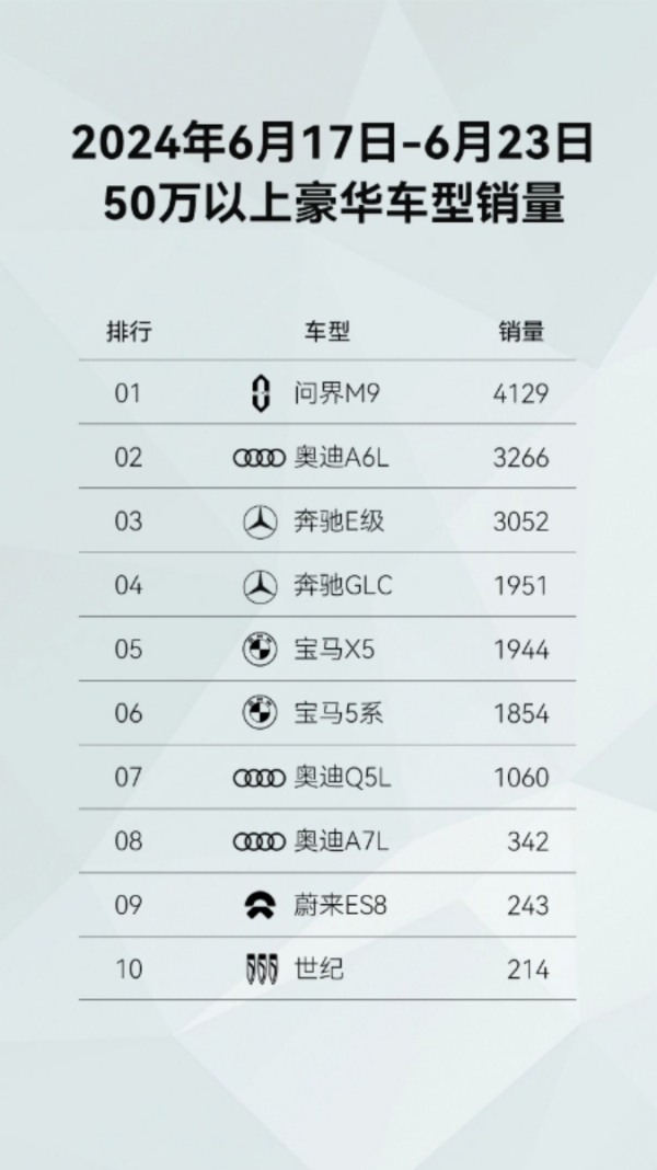 借势电动化、智能化浪潮快速崛起的中国新能源汽车品牌,不仅撼动了10-25万主流合资品牌的地位,更在逐步赢得30万以上传统豪华品牌的市场份额。而在更高端的50万以上价格区间,问界M9“走了出来”,并且是唯一上榜50万以上豪华车型销量前十榜单的中国品牌车型。