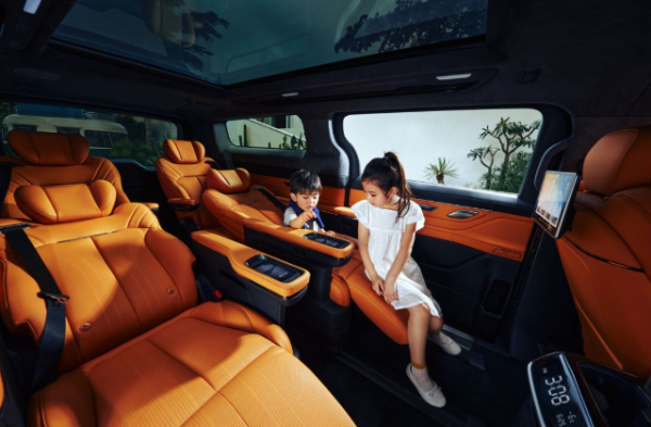 “空间王者”L380拥有5316mm的超长车身以及3185mm的轴距,整体得舱率达到75%,人均座舱面积大于1.13平米,媲美空客大飞机。