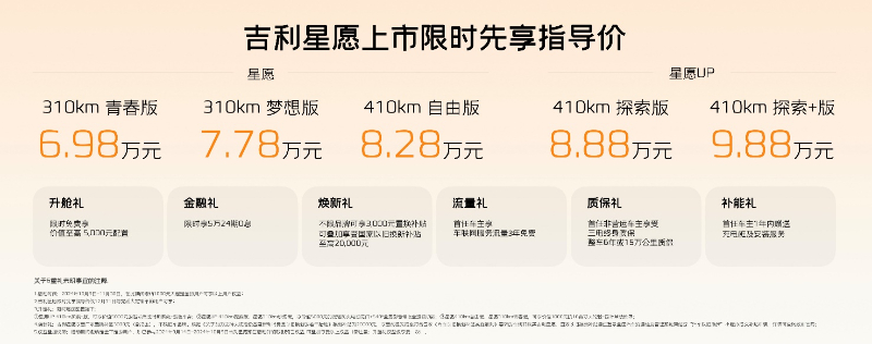 10月9日,吉利全新A0级纯电小车吉利星愿正式上市。新车共推出星愿和星愿UP两个系列共5个版型,售价区间6.98万元-9.88万元。同时,还推出一系列丰厚的限时购车权益,包括: