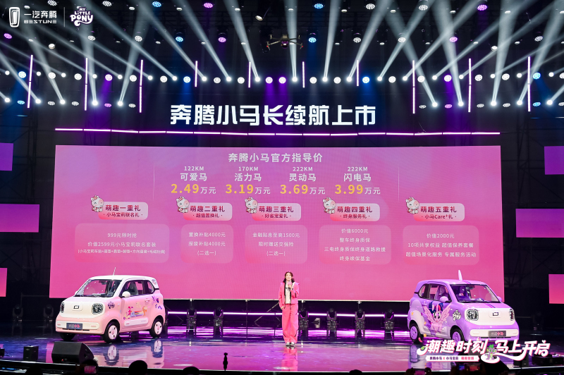 10月28日,“潮趣时刻 马上开启——奔腾小马长续航上新发布”活动在杭州活力绽放。一汽奔腾携手全球超人气IP小马宝莉,正式推出奔腾小马222km长续航车型——“灵动马与闪电马”,售价3.69万元及3.99万元。全车系覆盖2.49万-3.99万元价格区间,为用户提供个性化丰富选择。携续航、功能、动力、智能四大上新,两款车型均拥有同级最长222km续航里程,慢充、快充可随心选,带来更少焦虑、更少顾虑的微电出行新体验。