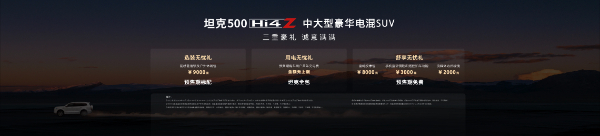 坦克500 Hi4-Z定位中大型豪华电混SUV,卓越的性能和豪华配置成为越野新能源市场的新标杆,拥有“全新智能、全面安全、全系豪华”三大配置亮点。