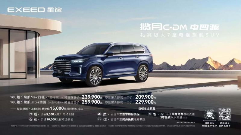 揽月C-DM定位礼宾级大7座电混旗舰SUV,共推出180超长续航Max四驱、180超长续航Ultra四驱两个版本,均配有2+2+2的6座、2+3+2的7座可选。官方预售价格23.99万元-25.99万元。
