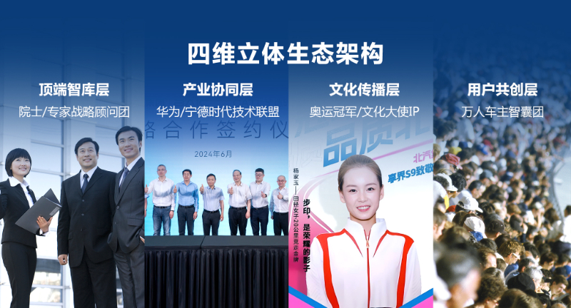 “品牌挚友计划”是北汽集团“品牌三年跃升行动”的重要引擎,构建一个“四维立体生态”:顶端智库层,邀请院士、专家、经济学家组成战略顾问团;产业协同层,与华为、宁德时代等合作伙伴共建技术品牌联盟;文化传播层,携手奥运冠军、文化名人打造"美好出行大使"IP;用户共创层,建立万人级车主智囊团。除了外部资源,品牌挚友计划还将逐步拓展至20位内部管理者及300名KOE员工。