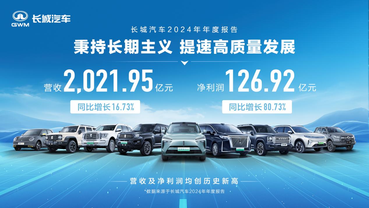 在国内汽车市场竞争日趋激烈的背景下,长城汽车交出了一份令人瞩目的年度答卷。3月28日,长城汽车股份有限公司(股票代码:601633.SH,02333.HK,82333.HK)发布2024年年度报告显示,公司营收2,021.95亿元,同比增长16.73%;净利润126.92亿元,同比增长80.73%;扣非归母净利润97.35亿元,同比增长101.4%。这组数据背后,是一家深耕汽车产业35年企业的坚定坚守与持续创新。