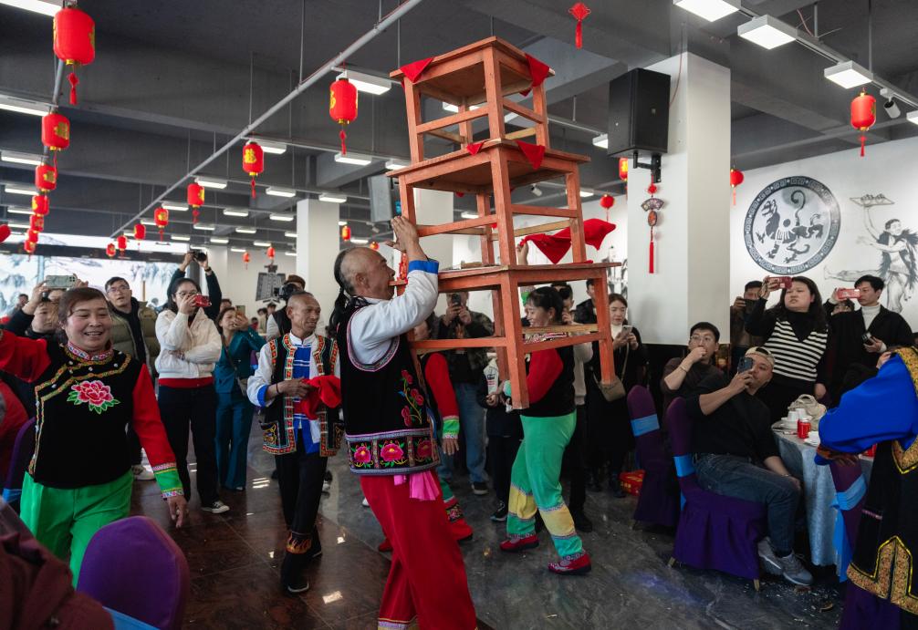 跳菜表演者头顶托盘、口咬桌角、三翻三转……