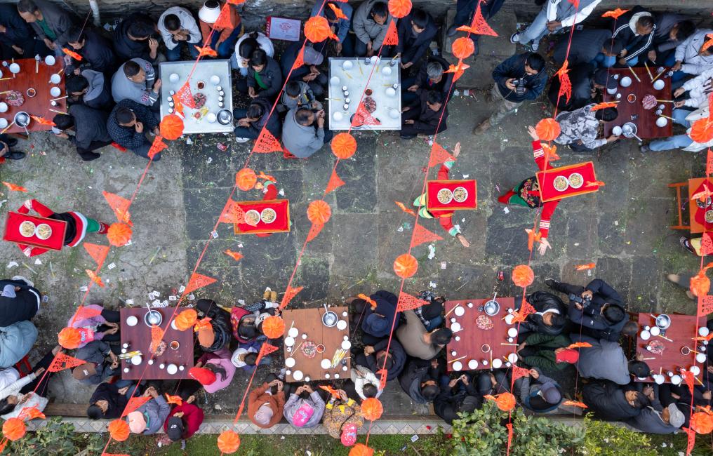 当地村民在火红的灯笼下摆开宴席