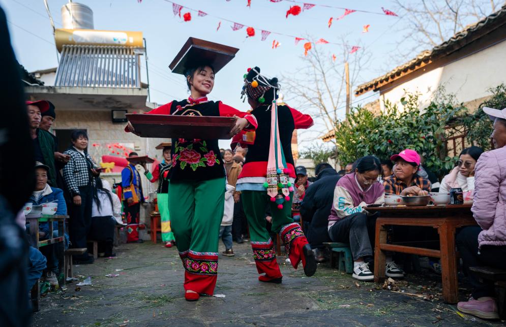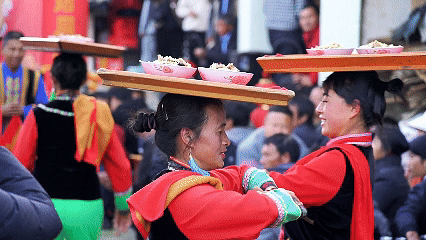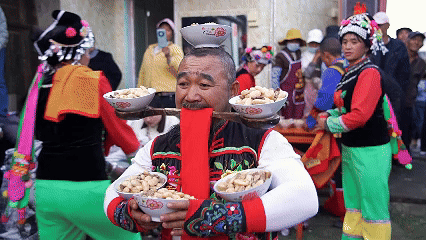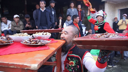 当地彝族民间办宴席上菜时