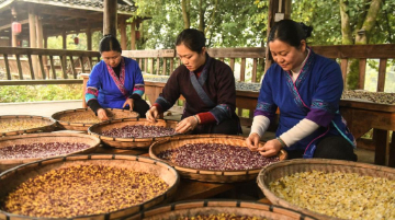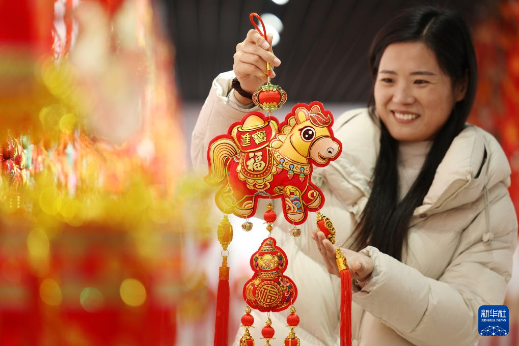 1月15日,在山东省临沂市郯城县红花镇一家中国结饰品加工企业,工作人员展示马年挂件。