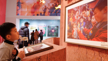1月17日,在山东滕州博物馆文创商店,一名小朋友选购“踏马游春”文创摆件。
