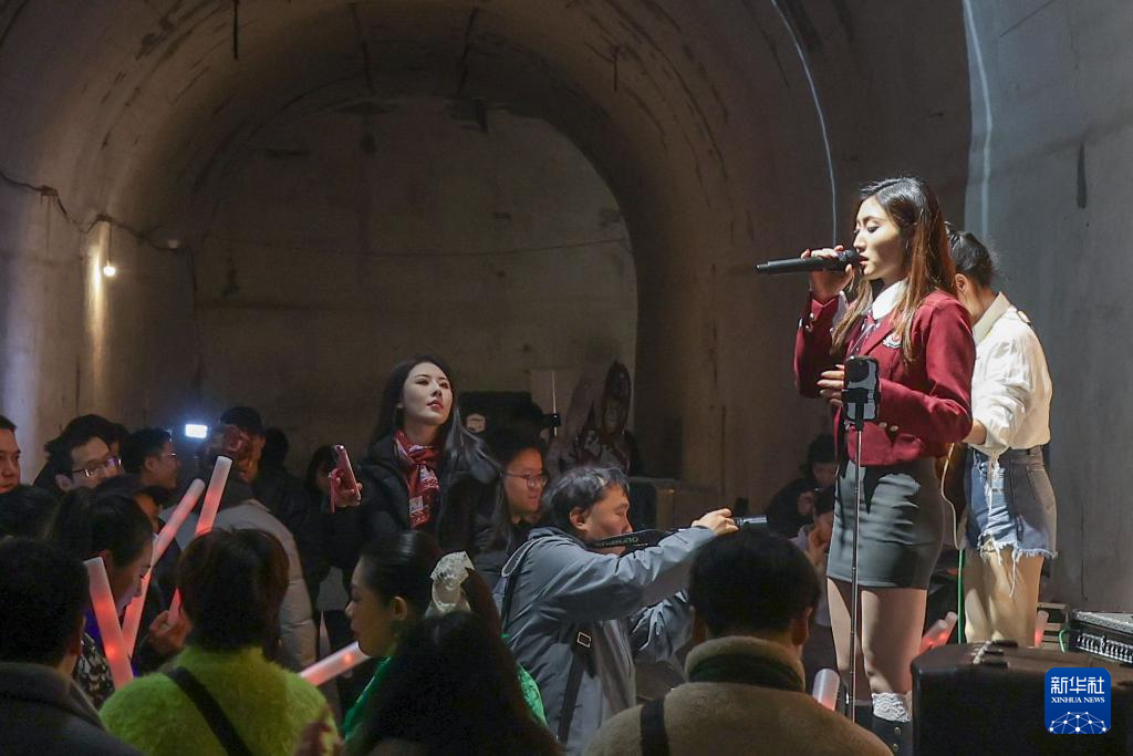 1月31日晚,0208女子乐队在重庆地下之城防空洞演唱歌曲。