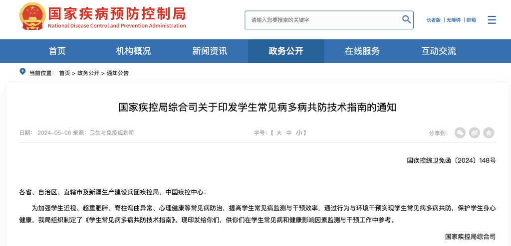 新华社北京5月7日电(记者顾天成)近视、超重肥胖、脊柱弯曲异常、心理健康问题……这些学生群体的常见问题,可以通过行为与环境干预实现多病共防。近日,国家疾控局发布《学生常见病多病共防技术指南》,首次明确学生常见病“多病共防”的概念,并提出监测和干预措施。