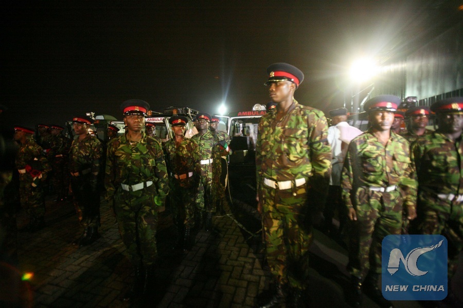 Kenya Defence Forces (KDF) soldiers prepare to receive the bodies of Kenyan soldiers killed by Al Shabaab, at the Wilson Airport in Nairobi, capital of Kenya, Jan. 18, 2016. The first batch of bodies of the KDF soldiers killed in Somalia's El Adde region were received on Monday. (Xinhua/John Okoyo)