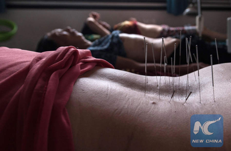 Patients have acupuncture at a village clinic in Shijiazhuang City, Hebei Province, China, Aug. 25, 2016.