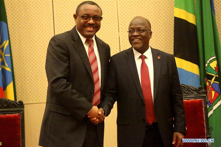 Tanzanian President John Magufuli (R) meets with the visiting Ethiopian Prime Minister Hailemariam Desalegn at State House in Dar es Salaam, Tanzania, March 31, 2017. (Xinhua/Anthony Siame)