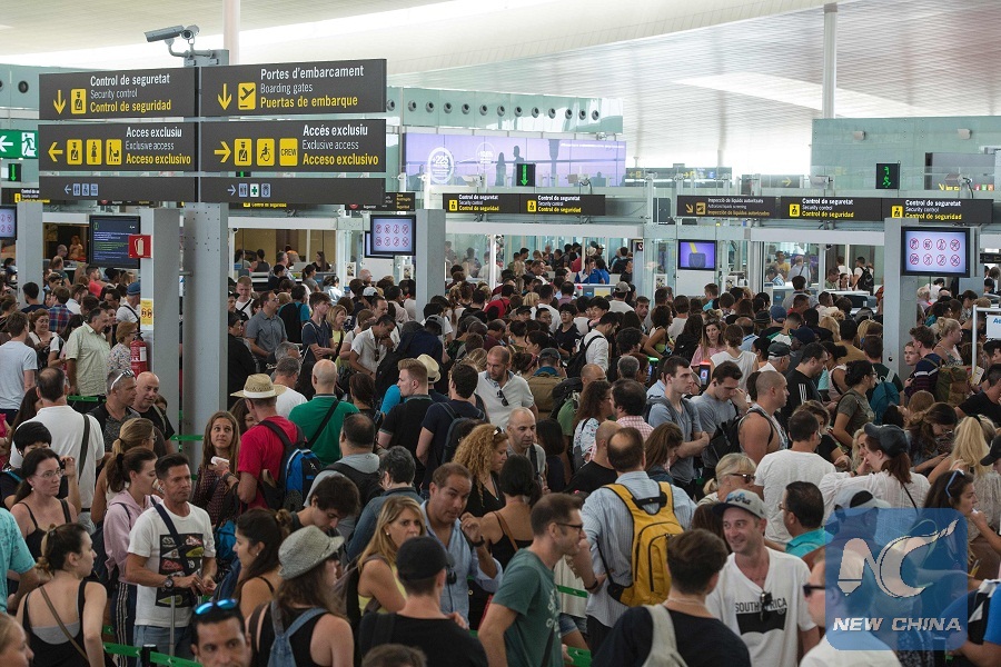 MADRID, Aug. 8 (Xinhua) -- A third day of strike action by security staff at Barcelona's El Prat airport has caused considerable delays to travelers, Spanish media reported Monday.