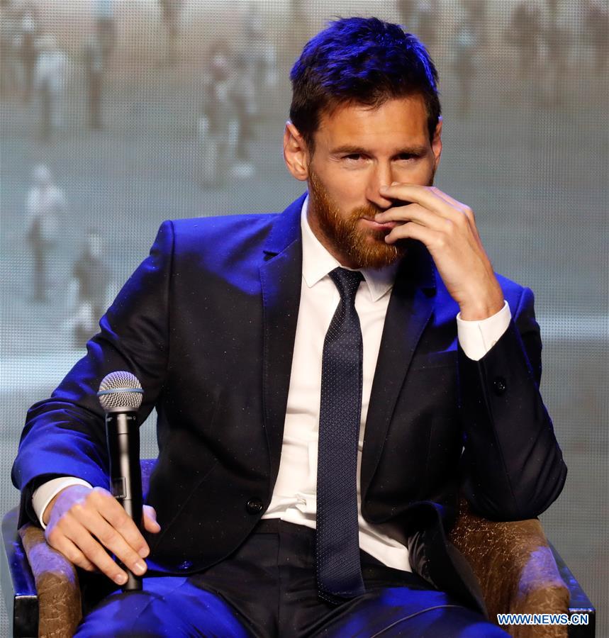 File photo: FC Barcelona's striker Lionel Messi of Argentina reacts during a press conference of Messi China Tour in Beijing, captial of China, on June 1, 2017. (Xinhua/Wang Lili)