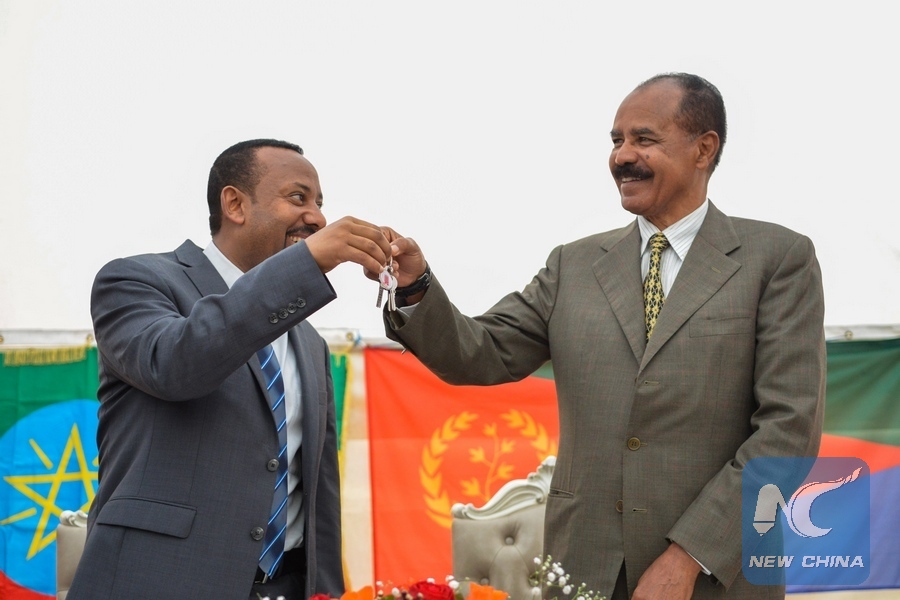 Ethiopian Prime Minister Abiy Ahmed hands over the key of the Eritrean Embassy in Addis Ababa to Eritrean President Isaias Afwerki on the reopening ceremony of the Eritrean Embassy in Ethiopia on July 16, 2018. (Xinhua/Michael Tewelde)