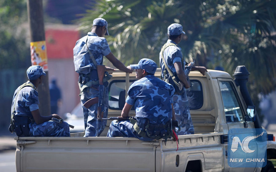 File photo shows security personnel patrol on the street in Addis Ababa, Ethiopia. (Xinhua/Zhao Yingquan)