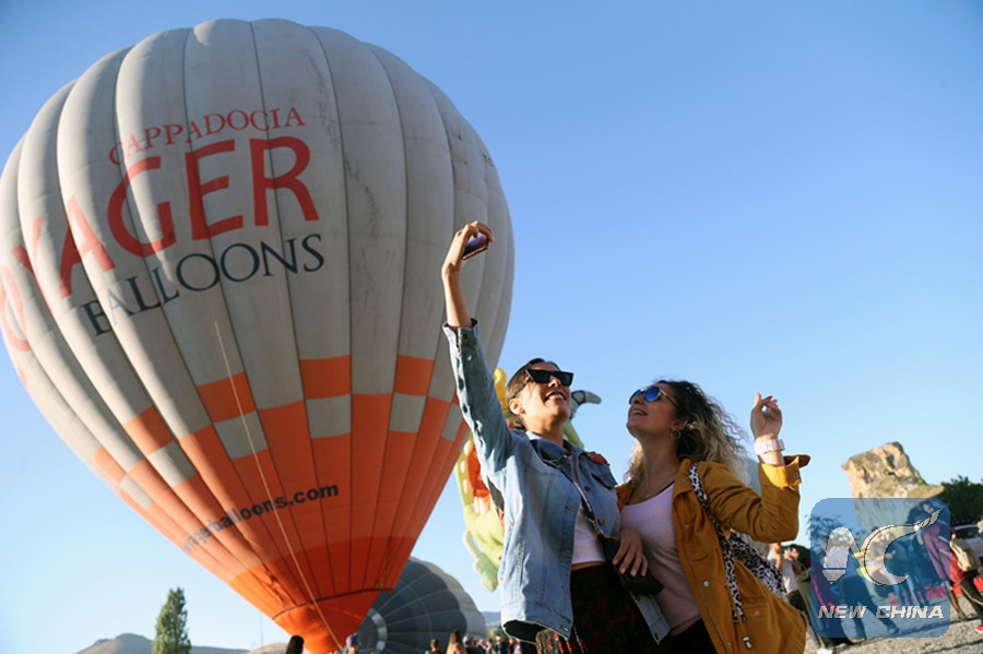 Visitors take selfies during a balloon festival in Cappadocia, Turkey, on July 4, 2019. (Xinhua/Mustafa Kaya)