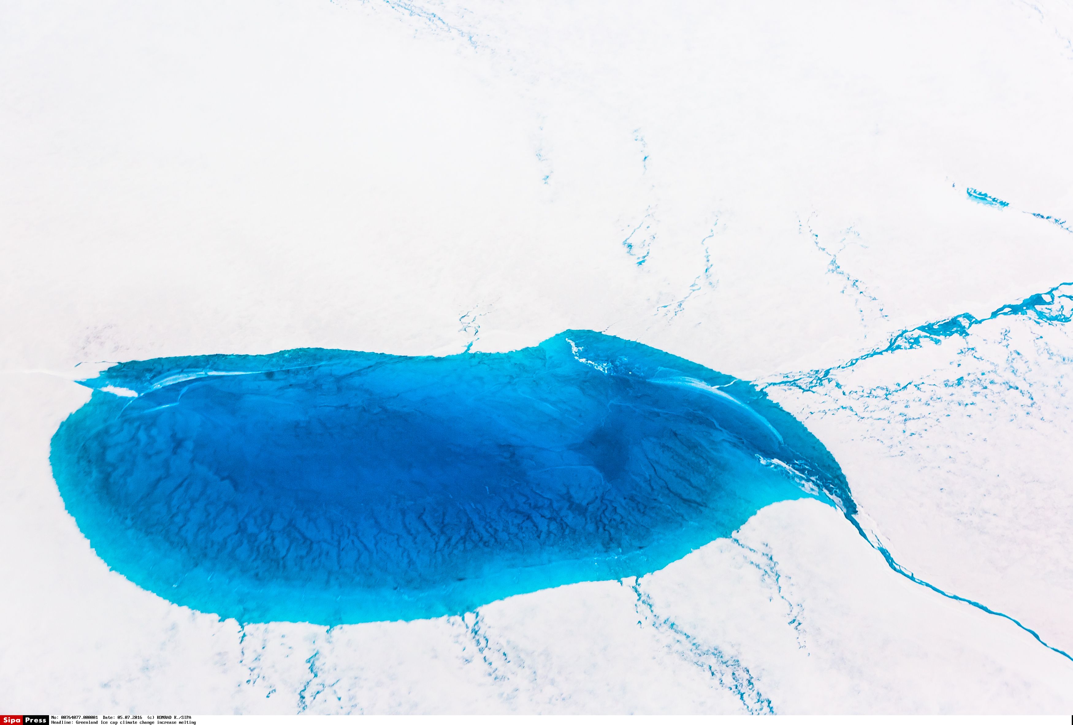 Aerial photo of supra-glacial lake and meltwater rivers located on the Greenland ice cap, about 80 kilometers east of Kangerlussuaq.(SIPA/Handout via Xinhua)