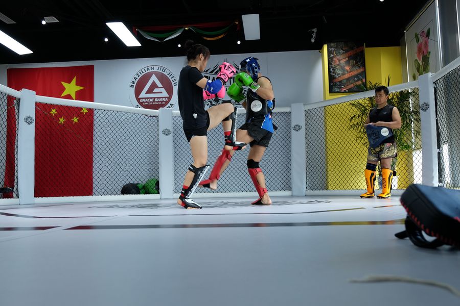 A powerful knee from the strawweight contender rocks her coach at her gym in Beijing on August 23, 2019. (Xinhua/Jonathan Dixon)