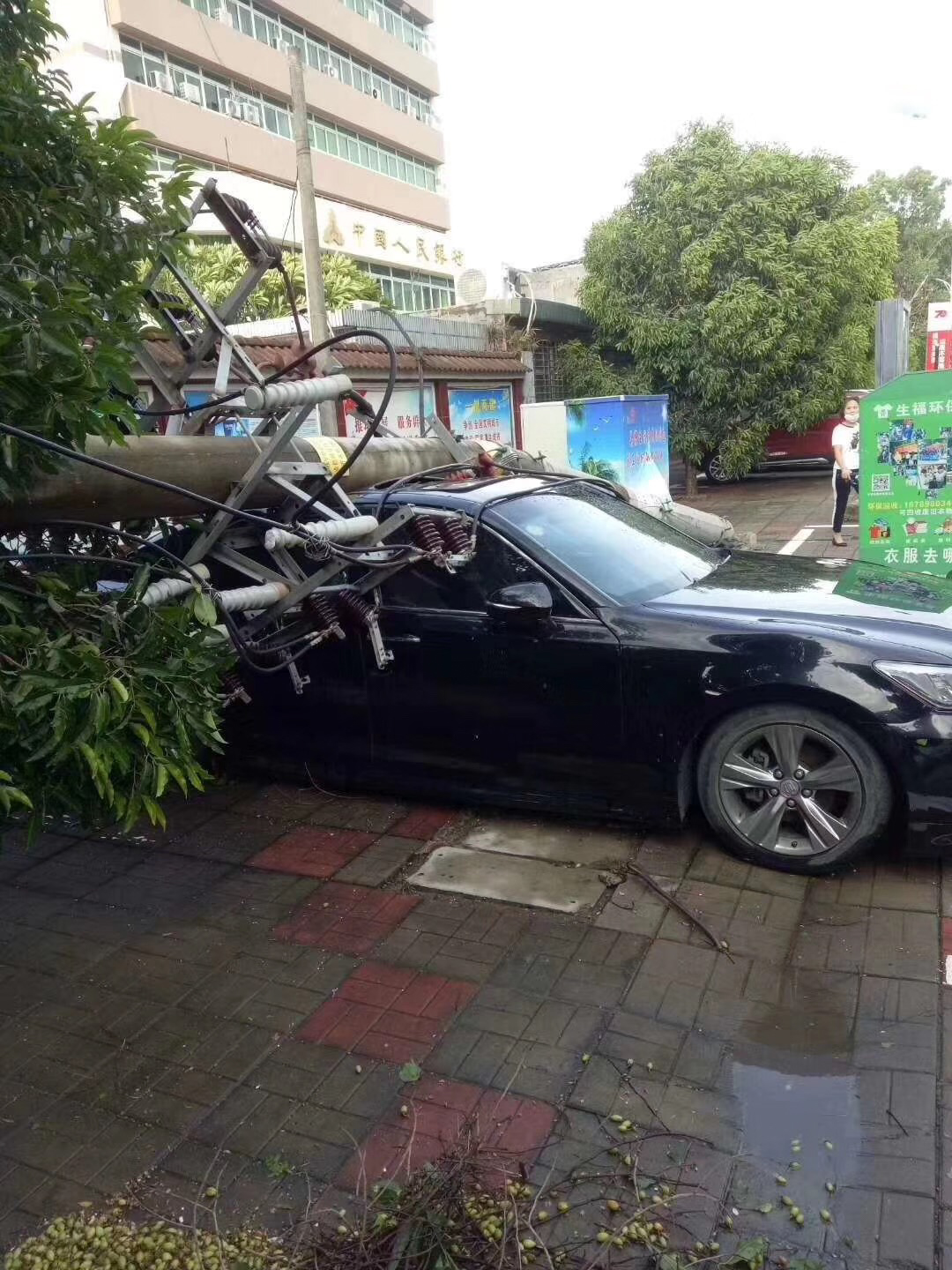 A car is crushed by a utility pole after a tornado ripped across Nada Township of Danzhou City, south China's Hainan Province, Aug. 29, 2019.(Xinhua)