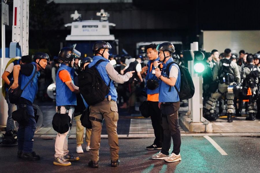 Blue-vested media liaison officers of Hong Kong police work during protests. (Xinhua/HK Police Force)