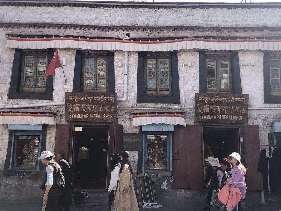Covering an area of no more than 100 square meters, it catches the eyes of pedestrians in Barkhor Street in central Lhasa, with its traditional Tibetan furnishing on the front and a sign inscribed with the name in Tibetan, Chinese and English -- Syamukapu Nepali Shop.
