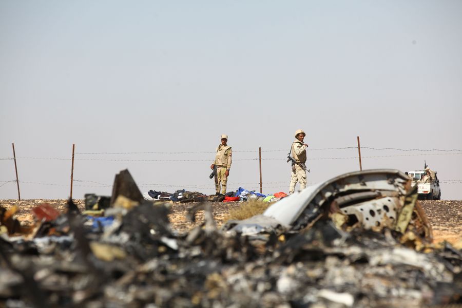 Egyptian soldiers stand guard near the wreckage of a Russian passenger plane that crashed in later October 2015 on the Sinai peninsula shortly after taking off from the Sharm el-Sheikh airport, on Nov. 1, 2015. (Xinhua/Ahmed Gomaa)