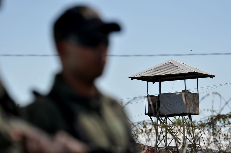 A custodian of La Joya prison complex guards the prison's entrance, in Panama City, capital of Panama, on Sept. 14, 2011.(Xinhua/Mauricio Valenzuela)