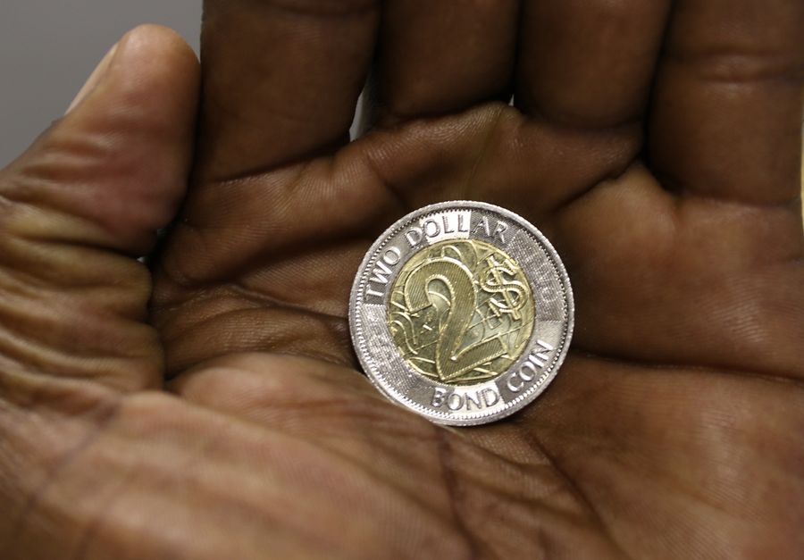 The photo shows the new 2 dollar bond coin issued by the Reserve Bank of Zimbabwe (RBZ) to ease current cash shortages in Harare, Zimbabwe, on Nov. 12, 2019. (Xinhua/Shaun Jusa)