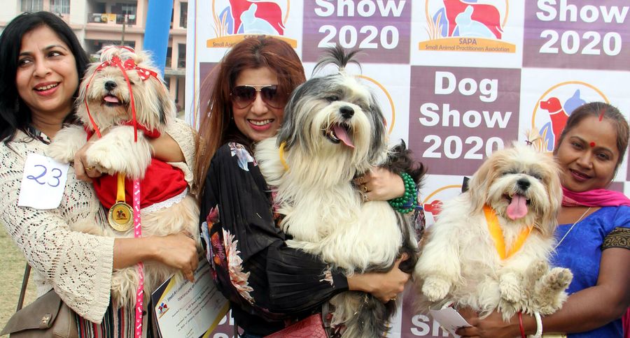 Participants are showing their dogs during a dog show in Gauhati, India, Jan. 19, 2020. (Str/Xinhua)