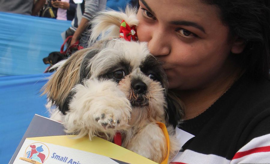 A woman kisses her dog during a dog show in Gauhati, India, Jan. 19, 2020. (Str/Xinhua)