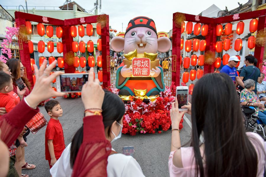 People take photos for the Rat decorations at the Penang Chinese New Year Celebration "Miao Hui" in Penang, Malaysia, Feb. 2, 2020. (Photo by Chong Voon Chung/Xinhua)
