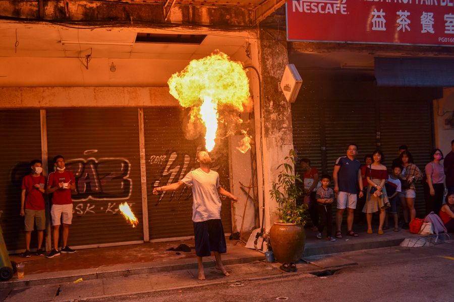 A fire breather performs at the Penang Chinese New Year Celebration "Miao Hui" in Penang, Malaysia, Feb. 2, 2020. (Photo by Chong Voon Chung/Xinhua)