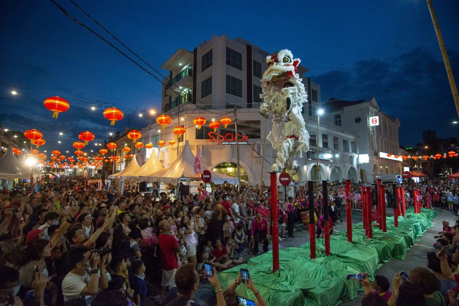 People enjoy the traditional lion dance performance at the Penang Chinese New Year Celebration "Miao Hui" in Penang, Malaysia, Feb. 2, 2020. (Photo by Chong Voon Chung/Xinhua) ■