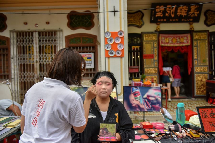 A visitor puts on opera makeup at the Penang Chinese New Year Celebration "Miao Hui" in Penang, Malaysia, Feb. 2, 2020. (Photo by Chong Voon Chung/Xinhua)