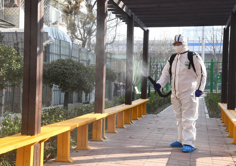 A staff member disinfects public seats at a community in Haidian District in Beijing, capital of China, Jan. 29, 2020. (Xinhua/Ren Chao)